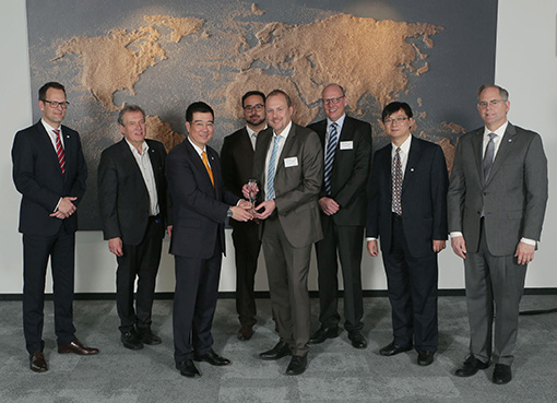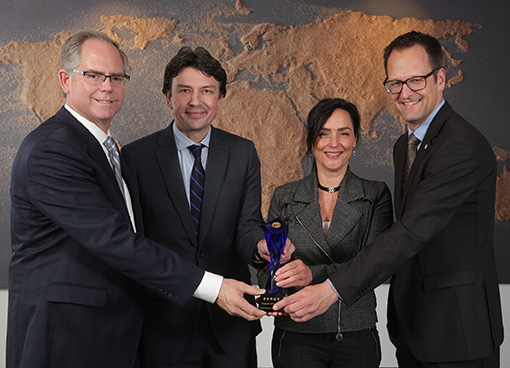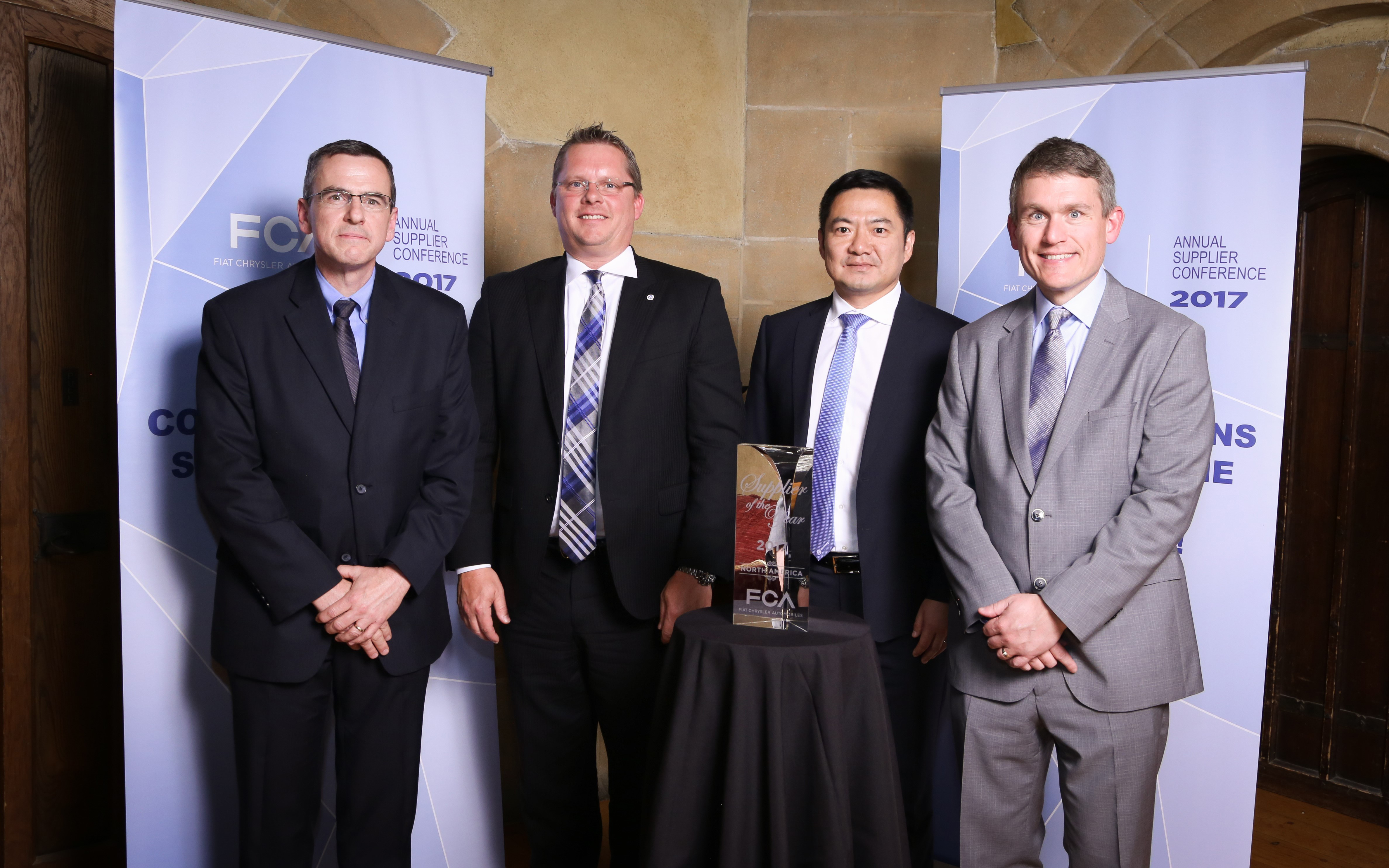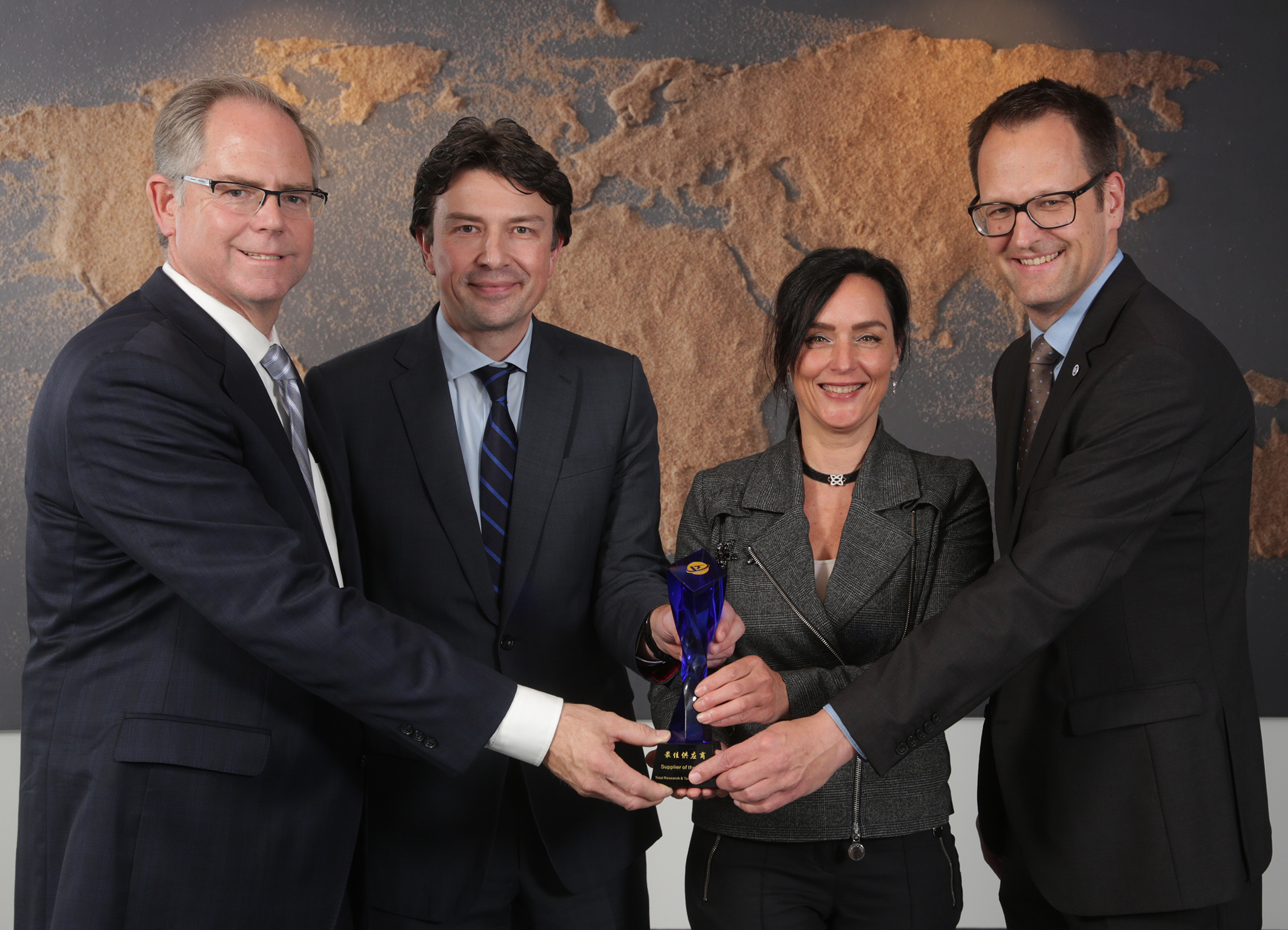 YFAI zeichnet das belgische Unternehmen Total Research & Technology Feluy als "Lieferant des Jahres" aus. Von links nach rechts: James Bos, Vice President Global Procurement von YFAI, Tim Mortiers, Global Sales & Marketing Manager PP Automotive von Total und Caroline Schills, Technical Manager von Total sowie Gunnar Büchter, Executive Director Procurement and Strategy Europe & South Africa von YFAI.