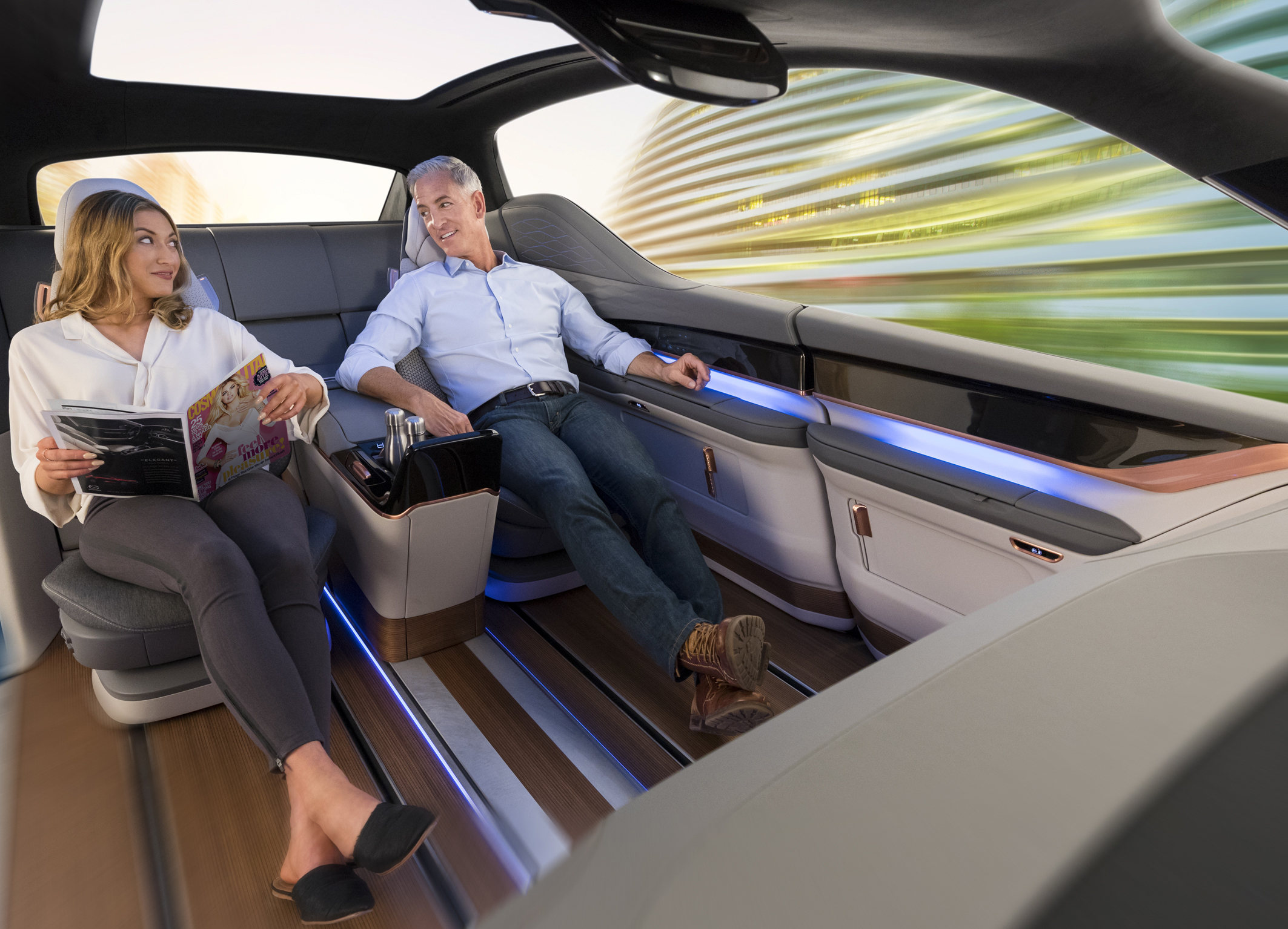 Der Family Mode des XiM18 von Yanfeng Automotive Interiors bringt die Insassen näher zusammen und erleichtert die Kommunikation im Fahrzeug. Dazu drehen sich die Vordersitze nach innen, die hintere Mittelkonsole fährt nach vorne und die separaten Rücksitze verschmelzen zu einer Sitzbank.