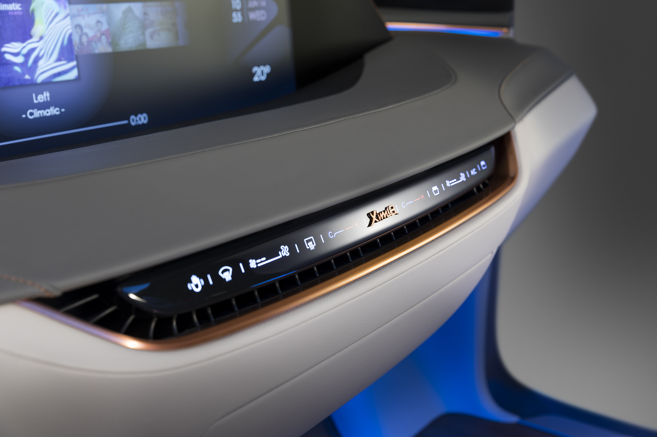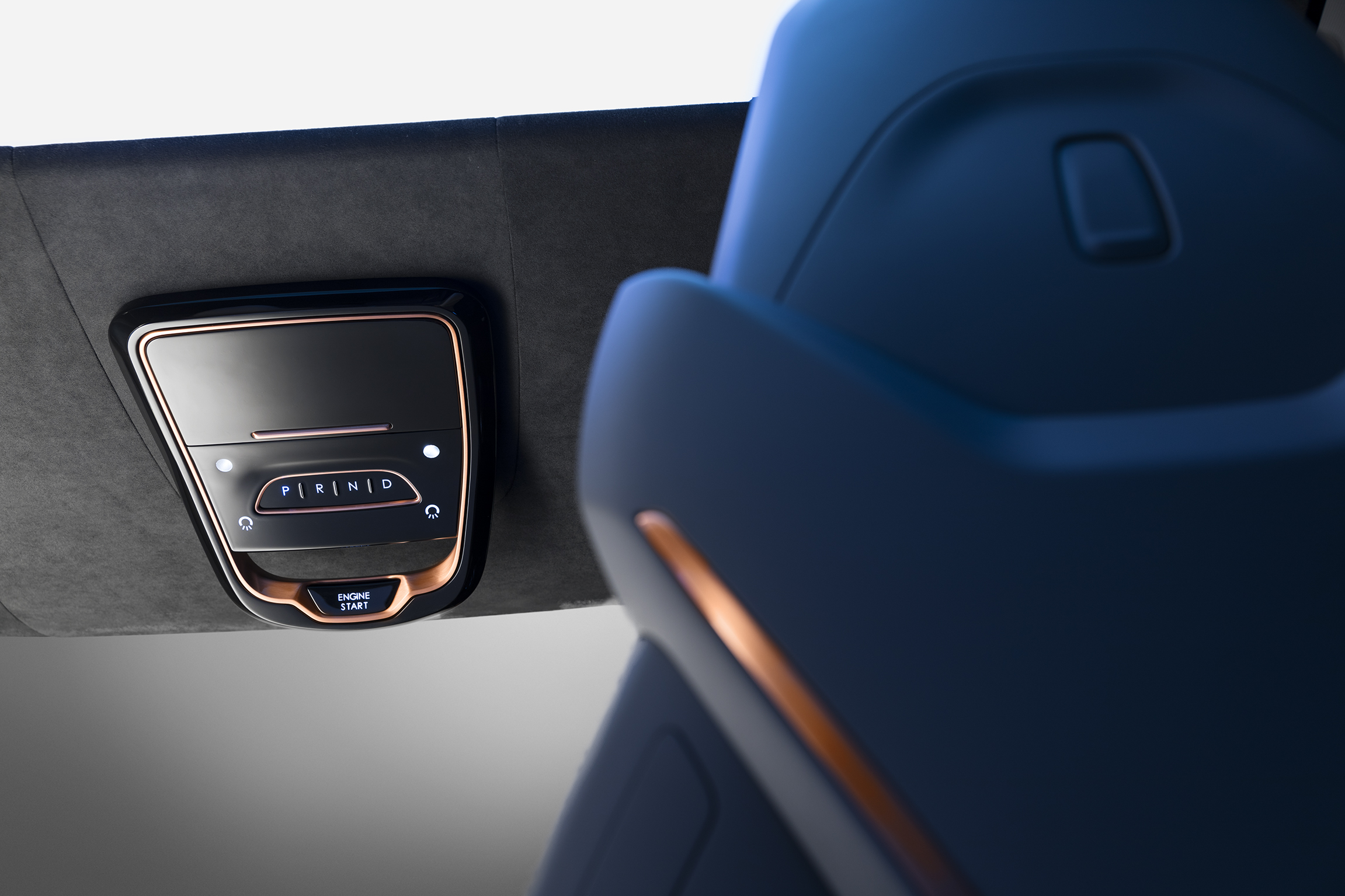 Dank Control-by-Wire-Technologie ist der Start-Stopp-Knopf und die Fahrstufenwahl (P-R-N-D) im neuen XiM18 Konzept-fahrzeug von Yanfeng Automotive Interiors in der Dachbedieneinheit untergebracht. Dadurch entfällt die konventionelle Bedienung in der Instrumententafel oder Mittelkonsole.