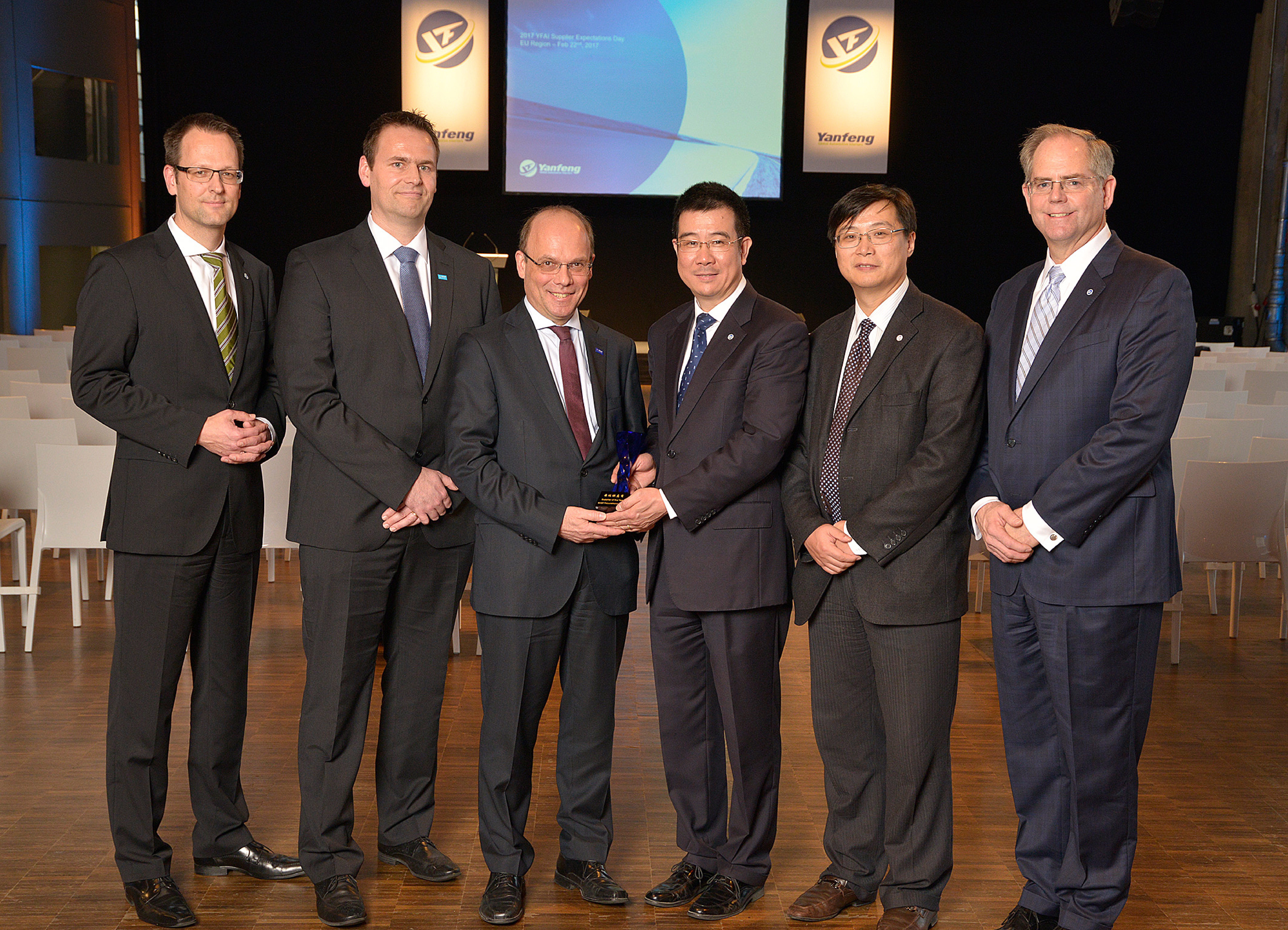 YFAI presented the European Supplier Awards to 15 top companies in recognition of their outstanding achievements. From left to right: Gunnar Büchter, Director Procurement Europe & South Africa at YFAI, Cord Schmalkuche, Team Leader Sales Interior/Exterior Transportation Europe of the division Performance Materials at BASF, Hans-Peter Beringer, Vice President Transportation Europe of the division Performance Materials at BASF, Joseph Lee, Vice President and Deputy General Manager Europe & South Africa, Tao Wang, Vice President Procurement and James Bos, Vice President Global Procurement (all YFAI)